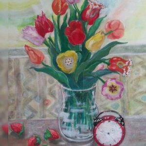 庭を可愛らしさで楽しませ 心を弾ませてくれたチューリップ🌷.* その最後の花も終わり… チューリップ賛歌を絵にしました(*'▽'*)♪ 見て頂けると嬉しいな🌷 題 「 春の水 」 編集がうまくいかず… 左端がダブり( * . .)" 💧