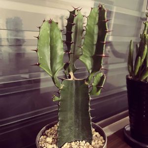 色々購入したオマケで貰ったユーフォルビア(大雲閣?)のドライフラワー😁(挿木でつかなかった枝😅) 背丈が80センチ程で何とも言えない迫力とオーラが✨✨ 枯れたサボテンって言っちゃえばそうなのですが、こんな葉や枝も好きなんです🤭 まだ緑の部分も有るからカットしたら復活するのか聞いたら「こりゃ無理ですね」って言われたから、しばらくの間は生と枯の混在を楽しむ事に😆 原生地にはこんな姿の子が沢山居るんだろぉな〜って、いつかは行きたいと思いつつ眺めてます🤤
