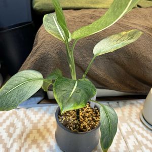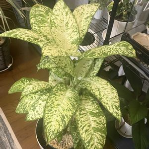 初開花😊ディフェンバキアティキ😊びっくり🫢 ディフェンバキアは、主に美しい葉を観賞する観葉植物ですが、花を咲かせることがあります。 ただし、一般的にイメージするような華やかで目立つ花ではありません。サトイモ科の植物によく見られる特徴的な形の花を咲かせます。 ディフェンバキアの花の特徴 * 仏炎苞(ぶつえんほう)と肉穂花序(にくすいかじょ): ディフェンバキアの花は、サトイモ科の植物(例えばカラーやミズバショウなど)と同じように、**仏炎苞(ぶつえんほう)と呼ばれる葉が変化した部分に包まれています。この仏炎苞は、一般的には白や薄緑色で、花(肉穂花序)を保護するように筒状になっています。 本当の花は、この仏炎苞の中に隠れている肉穂花序(にくすいかじょ)**と呼ばれる棒状の部分に密集しています。肉穂花序は黄色や白っぽい色をしています。 * 地味で目立たない: ディフェンバキアの葉の美しさに比べると、花は非常に地味で、葉陰に隠れて目立たないことが多いです。そのため、花が咲いていることに気づかないことも珍しくありません。 * 開花時期: 主に生育期の5月から9月頃に咲くことがあります。 花が咲いた後の対応 ディフェンバキアは葉を観賞する植物であるため、花を咲かせると株のエネルギーをそちらに消費してしまいます。そのため、花が咲いた場合は、株の生育を優先するために剪定して取り除くことが推奨されます。 * 剪定の理由: 花をそのままにしておくと、株の栄養が花や種子の形成に偏り、葉の成長が停滞したり、株自体が弱ってしまったりする可能性があります。 * 剪定の仕方: 花が確認できたら、すぐに花茎の根元から切り取ってください。 ディフェンバキアの花は、その存在自体が珍しいため、咲くのを見つけると少し嬉しいかもしれませんが、基本的には株を健全に保つために取り除くと良いでしょう。