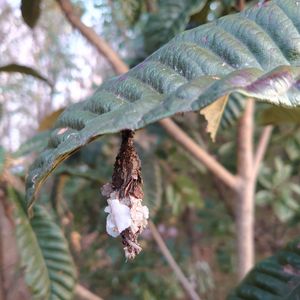 枇杷の葉っぱの下にミノムシ。 葉っぱがちょうど屋根のようになって雨に濡れない。 まとっている蓑の白いのって、レジ袋(⊙⊙)!?モシカシテ