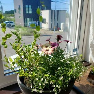 シックな寄せ植えも好きだけど、こんなポップな色合わせの寄せ植えも好きです☺️ 横長の鉢にビンカのタトゥー2つ、真ん中はピンクで右奥は赤です。夏の元気な寄せ植えには欠かせないジニア プロフュージョンのオレンジ🍊後方に少し背が高くなるアキレア、色は赤と黄色が混じっている元気色です。 前には枝垂れて広がる黄色のメカルドニア ゴールドダスト。 葉物🌿も花に負けないインパクトのあるものを。ヒューケラのタペストリーと自由に動きを作るゴールデンハニーサックルです😃