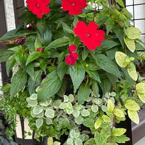赤が素敵です❤️ サンパチェンスとリーフの ハンギングバスケットです。 1か月前に作りました(7/29投稿) 大好きなカラジウムは、 消滅してしまいました。 残念(-。-;💦 植える時に無理やり株を 分けたのが原因か思います。 それでも、生命力旺盛な サンパチェンスが、バスケットを 覆ってくれて、なんとか形に なってます。 玄関の軒下から、夏の元気を お届けします*\(^o^)/*