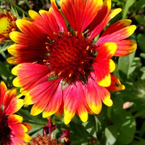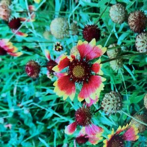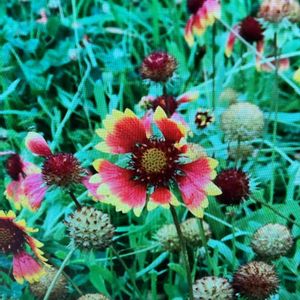 花が殖えてきたテンニンギクです。 赤と黄色の花びらが緑の中に映えます。