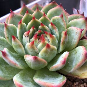 みどり色で黄色で桃色な子🍑💛💚 セトーサ×メキシカンジャイアント 梅雨明け頃に買ってこんだけ紅葉するとは 思わなかったなー でも元々黄色い系ではあった🤭