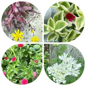 おはようございます☀ 好天が続きますね😄 左上かおりんのオルレアです。種蒔きして失敗!結局ひとつも🌱が出ませんでした。 なので2年前にうちからジム仲間の家に分けてあげたお宅へ行ってひと苗もらってきました。元はかおりんさんの種からのオルレア💕来年はリベンジして増やすゾー✌ 左上は、PWさんのスーパーベル ダブルピンクリップル去年から冬もずうっと咲き続けています。 左下は、ハーブのチャイブの花 右下は、友達から挿し木で頂いた薔薇🌹名前は不明です。蕾の時から虫にかじられながらも、賢明に咲いてくれました。