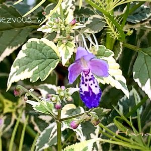 斑入りカリガネソウ 3年目🏷️今年も咲いた 小さなお花が魅力的❁💜💙 (1センチ?!よく見ないとわからない) ②拡大してみた (何か模様があるね〜 蕊が、クルン🎶) 別名 カリオプテリス ディバリカータ スノーフェアリー 🏷️ながぁ~いなまえ ややこしい名前 ほんまややこしい🤭 でも、名前聞かれて スラスラ言えたら、 カッコイイわね〜❁ ばあちゃん やるじゃん🤭👍