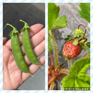 いちごが赤くなり始めてる〜🥰🍓 絹さやベビーも見えてきた😎