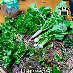 七草でしたね🥰 眠くて日付変わる直前やっとup ( - - *)ウトウト すずしろ(大根) すずな(かぶ) セリ ハコベラ(ハコベ) ゴギョウ(ハハコグサ) ナズナ(ペンペン草) ホトケノザ(コオニタビラコ/小鬼田平子) ヨモギ、カラスノエンドウはついでに *ホトケノザと呼ばれる一般的な紫花のでは無い。黄花。 寒い時ロゼット状になってるのを仏に例えて。 大根、カブ、セリ、ハコベは余裕で、家にありました。 後は、散歩で探しました(家にあるのかな?) ハハコグサ1本しかみつからず、 何故?(°д°) コオニタビラコは今一つ不安なんで、食べませんでした(多分オニタビラコ/食べてる人いるけど、自信無いので) 種取り大根の大根使用 密集してて、こんな小さなのがありました。丁度良かった❤️ 「wikiより 七草(ななくさ)は、人日の節句(1月7日)の朝に、7種の野草あるいは野菜が入った粥(七草粥)を食べる風習のこと。 元々の「七草」は秋の七草を指し、小正月1月15日のものは「七種」と書く。この七種も「ななくさ」と読み、一般には7日正月のものを七草と書くなど、現在では元々の意味がわからなくなり、風習だけが形式として残った。これらの事から、人日の風習と小正月の風習が混ざり、1月7日に「七草粥」が食べられるようになったと考えられる。」 ☆インクSF葉牡丹 今こんな感じ
