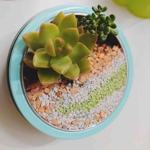 lierさん2周年セットの苗がまだ残っていたので寄せ植え🌱 なかなか根が出ないのでとりあえず放置😅 暑くなってきたので詰めずにカラーサンドを使いました🐚鉢は自分で塗りました☺️