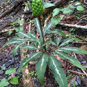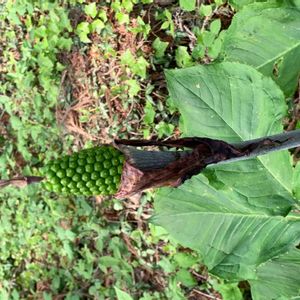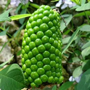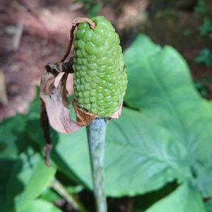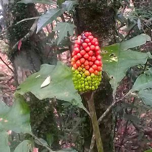 林の木陰にいましたいました! 蝮(まむし)そのものの姿をした花は残念ながらもぅ見れず(>.<) だけど…蝮の肌のような不気味な太い茎…ブルブル 🌽のような青々とした実(赤くなる)が見れ満足…ルンルン 滝野すずらん丘陵公園…⑧
