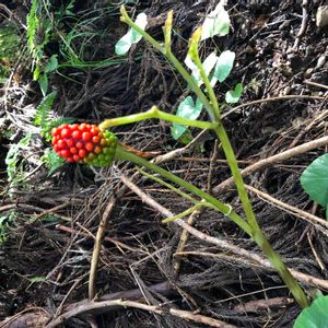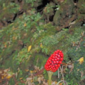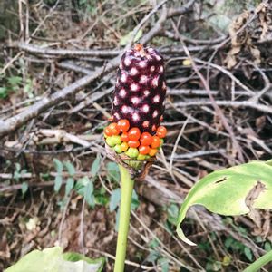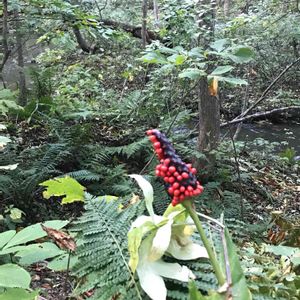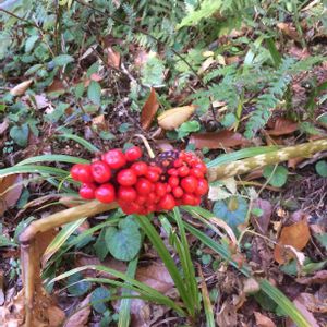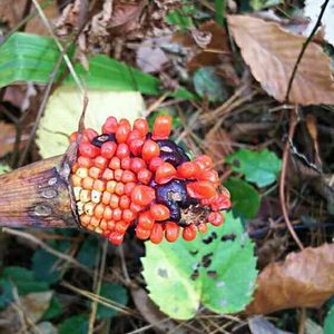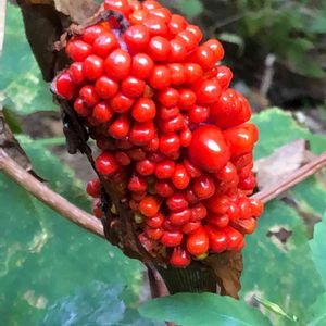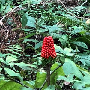 高山植物の実だと 思います。 千畳敷カールに行くバス🚌 の窓から真っ赤に色づいた実が 目を引きました。 ロープウェイ乗り場のバス🚌停 に行く途中で見つけたので パチリ🤳 調べたらマムシグサの実でした。 花からは想像できない実😳