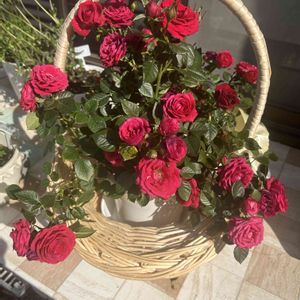 ご近所さんから、カゴを頂いたのでバラの鉢をいれてみました。バラはミニバラでボルドーコルダーナという種類で、京成バラ園芸があつかっています。カゴにいれたらバラがいっそう引き立ってみえますね。