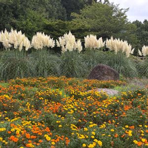 パンパスグラスとマリーゴールド🤍💛 パンパスグラスは少しクリーム色になって来ました🌾 2枚目の桂の木も黄色になり少し秋っぽくなりました🍁🍂