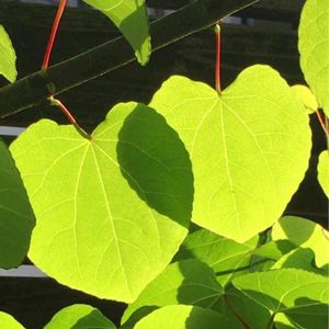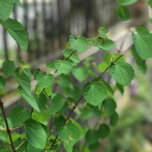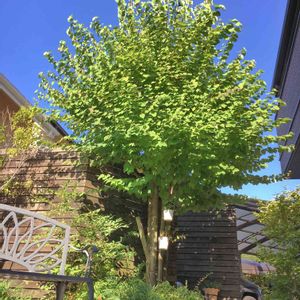 我が家の庭のシンボルツリー 桂の木 が落葉樹なので、赤茶色の裸になっていましたが、今月から小さな葉っぱが徐々に大きくなっています(╹◡╹) 現在の写真よりそのままの形で4〜5倍になるでしょう(^^) 30年で高さ30mにもなる様な話もあり、株立で現在は5m程度ですが、10mになる以前に先端を切らねばならないと考えています(T_T) 花は地味で気付かないくらいですが、ハート♥️がたの葉っぱが特徴のひとつです(^^) 背後の下に見える楕円形の葉はクレマチス ‘ベルオブウォーキングのもので、上に見えるのはそのオベリスクの葉です(^^) オベリスクは1Mくらいありますが、蔓はもうすぐてっぺんに届く勢いで、そのまま桂の木をぐんぐん登って行って欲しいものです(^^)