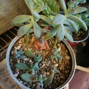 こちらは我が家で1番大きい多肉鉢。のびのび伸び放題。
