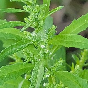 アリタソウ(有田草) ヒユ科アリタソウ属 中南米原産 河川敷で1ヶ所見つけています🎶 葉をちぎってみると ミントよりキツい薬品のような匂いがしました🌱 江戸時代に薬草としと渡来佐賀県の有田で栽培されていた物が逸出し、産地の名前が残りました😊🌱🎶 草丈0.6〜1m 茎には毛があり、多数分枝する 葉は互生、葉身3〜10cm長楕円形 縁には不規則で粗い鋸歯がある🌱 裏面には淡黄色の腺点がある ちぎると独特の匂いがある 枝先に緑色の花穂を円錐状に多数つける 花穂にはところどころ細長い苞が混じって付く🌱 花は両性花とその基部に小さい雌花を付ける 花が咲くと次々に枝を出す ①②③花穂が長く伸びず 枝が多数出ています(10/4) ④葉(8/15)と茎の毛 ⑤大きな両性花と基部に小さい雌花があります 雌花から糸状の雌蕊の柱頭が出ています 両性花の雄蕊の葯袋が白く花弁のように見えます(10/4)🤍💚🌱