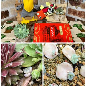 おはようございます😋 はちゅの日🦎参加しま〜す💕 前日イベントでゲットしたUGOZENさんのバケット鉢&クロワッサン鉢に韓国苗や葉挿しちゃんが大きくなった子たちをチマチマ寄せ植えしたよ💕💕 シエラちゃんの人面魚ちゃん🐟 まつぴよちゃんのBabyヤモリちゃん🦎 大福ちゃんのイグアナちゃん