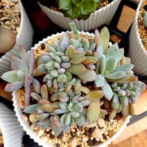 石原交配苗① 📍ピンクザラゴーサ × メキシカ ンジャイアント 📍メキシカンジャイアント × パープルエボニー 上の子は青白くて細くてほぼメキジャイだが爪のピンクが可愛い❣️ 下の子は少しふっくらした短めの葉で緑がかってるかな❣️ もちろんメキシカンジャイアントもいるしどう育つか楽しみの苗です🎵