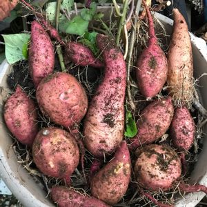 芋掘り2回目♪ 今日は4株。 あと大根間引き菜🌱コンクリート直置きですみません… 子供達誘ったけど、鬼滅に負ける母。 仕方なくまたもや1人で芋掘り… 10本100円の安納芋挿し穂?だったので、40円分と思えばヨシヨシ❣️ 先日収穫した方の畝(他の野菜の近く)はやっぱりコガネムシがゴロゴロ。ガジガジ。 畑の端にある畝は被害無し。お芋太ってなかったけど〜😅