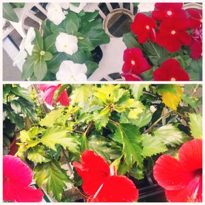 #111 最近の赤い花をコラージュしてみました。 ❇️左上から、バラ、ハナキリン 中央上から、日日草2種、ペチュニア 右上から、ブーゲンビリア、ハイビスカス