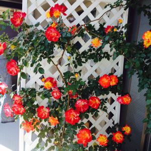 つるバラチャールストン かわいい~💛🧡❤️ 今年はこのバラが一番に咲いてきました 咲き進むと色変わりして赤色になります