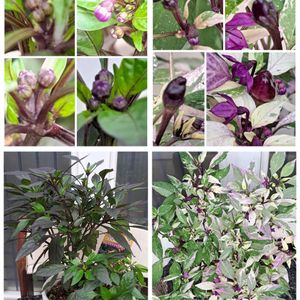 丸くて赤い実が可愛い観賞用唐辛子✨ 赤くなるまでの色の変化も楽しい😊 斑入り葉で紫の唐辛子はハロウィンに似合いそう💜