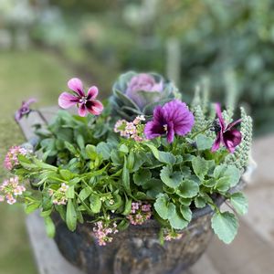 萌花ショコラさんの寄せ植え 今年は1輪ෆ.*・゚ディアーナさんとパピヨンさん入れて あの方シンプル寄せ植え リーフはお家のෆ.*・゚ 意外と素敵なビオラさんです お安い方だけど ロゼさんとカルーナさんෆ.*・゚ 背伸びしてるアンティークビオラさんෆ.*・゚素敵✨️ 今日の萌 わんわん可愛い🐕 ͗ ͗🐾♥️