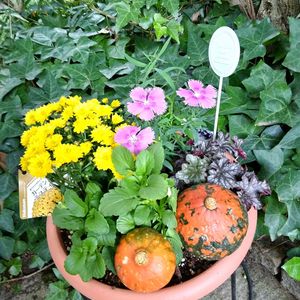 我が家の菜園の未熟の🎃カボチャです~。 ハロウィンに、丁度良い大きさなので、寄せ植えにインしました。😉 秋の寄せ植え マム(菊) ナデシコ ビオラ ヒューケラ 🍂玄関先の日だまりに、飾りました~。🎶🎶