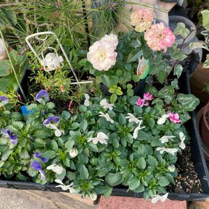 1ヶ月前、ビオラ2株植えただけだけど こんもりしてきました🌸 後ろのガーデンシクラメンが 隠れてしまうぐらいに💦 紫色のビオラの奥にはオキザリス 下にオレンジのチューリップ🌷 ダイソー産のです 春に丁度良くなる様にと思って まだ釣り合い取れてないけど 1ヶ月で白のビオラの勢いなかなかです🌸 ガーデンシクラメンと隣には ミニ薔薇グリーンアイス🌹 綺麗に咲いてます💖 春にチューリップ咲いたら オレンジで明るくなるかな🧡 今は黄色系の色がないので ちょっと寂しいけど😅