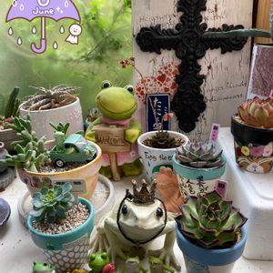 ムッチリぷくぷくの日🏷 6日はカエルの日🐸参加しまーす😁 ↗️いつものカエル君と多肉ちゃんの寄せ植え🐸 ↖️ユーフォルビア・プシュートグロボッサ ⬅️蛾角 ↙️アーモンドネックレス ⬇️姫将軍 ↘️鳳凰とカエルのリメ鉢