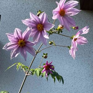 皇帝ダリア 台風に、二度倒されて、グッタリ していたものを、 ヤット、ここ迄、支えて、 きました。 小ぶりのお花ですが、咲かせて くれて、嬉しいです。 有難う❣️