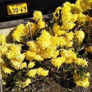 遠くから見ると 黄色い塊に見えて、 何の花だろう? と近付いて見たら 菊でした。 ちゃんと育てたら きっと見事な菊の種類でしょうに、こんなに雑に 駐車場の脇に…… もったいないなぁ。