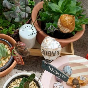 日頃から集め貯めている “クルミ”で プランターピックをつくってみました😊 多肉さんのお名前も 端革に書き込んで🎨…😊
