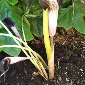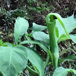 マムシグサ ( サトイモ科 テンナンショウ属) 真ん中から 蛇の頭のような 物が伸びてきます😱 今年は青っぽいので オスだと思います 去年は 黒っぽい 蛇の頭だったので メスでした😊 このマムシグサ メスとオスが コロコロ 変わるんだそうです サトイモ科なので 根っこの下に 芋がついています 栄養があって 大きいものはメス 栄養が少なく 芋が小さいのは 雄になるそうです🤭