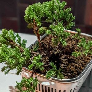 ハイビャクシン(ソナレ、磯馴)。 盆栽植え替えました。 庭木用にビニールポットで400円で売ってたハイビャクシンを盆栽化して もう十数年、かなり根周りが太り 盆栽らしくなってきました。 半懸崖にしようとしましたが、懸崖になってしまいました。ちょうど良い鉢が無いから😅 一枚目正面 二枚目裏 三枚目横です。