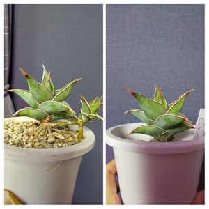 ピングイキュラ。 サンスベリアの女王(と呼ばれるらしい)。 右:2月 左:今日 子株!! が出来ているから親株も成長しているかと思ったけど変わっていない。むしろ休眠期間中に下葉が枯れて除去したから葉の枚数が減ったか? ( ˙꒳˙ ).。o(台風の影響で室内避難中。そんな中、せっかく室内でまじまじ見れるからGSにあまり取り上げない植物を投稿してみた)シリーズ?