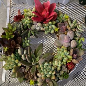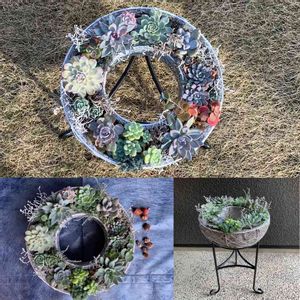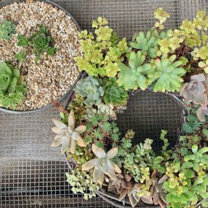 のびのび多肉リースと、ザルに植えたオロスタキスたち。 どんどん増えてね♩︎