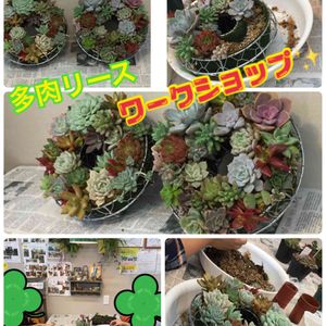 本日の多肉リースワークショップ^_^ エケベリアメインの方と、多品種ミックスの方の作品✨ どちらもみっちり植え込んでいただきました👍✨ 2週間もすれば、玄関にも掛けられます😄
