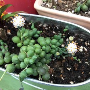 ベランダのグリーンネックレスに小さい可愛いお花が咲きました。