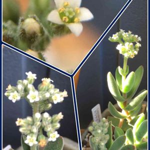 クラッスラ属 「カラサナ」にお花が咲きました😊 とっても小さな白い花。 その小さな花の中に さらにお花のような 雌しべさんかな? かわいい💕 写真 すべてピンぼけ😓 可愛さが伝わりますように。