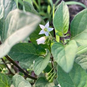 ♡今日のお花トウガラシ♡ 今日は隣の隣の町に鮎を食べに行くので お友達をお迎えに行きました🚙 なんと玄関先にトウガラシ🌶のお花が咲いていました✌️✌️✌️ ラッキー 早速🤳を撮りました❤️💚