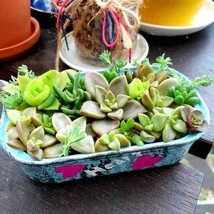 小さな寄せ植えです。 テラコッタ陶芸でミニミニ花壇を作りました。 只今10/7のイベントに向けてテラコッタ作品に多肉さんをせっせとちまちま寄せ植えしています。 楽しいけど肩がこりまーす。 (^◇^;)\