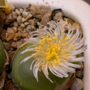 ①親指仙女が初開花です🐸白花でした🥰 株の方は双頭になってしまいました🙂3号鉢から4号鉢にしたいけど置き場が困るのでこのままで🙏💦 ②真ん中パゲアエ、まわり翡翠玉 翡翠玉一つ脱皮が始まりました!翡翠玉右上のがまたシワシワ😵根が成長不足かも😭 パゲアエは何㎝になったかな🐸2㎝はありそうです。 ③Rラツム 少しだけ大きくなりました🐸 ④マウガニー 脱皮して緑色が綺麗です。無事にこのまま育ちますように🥹 ⑤ミニマム 全部脱皮準備完了✨小さいのに丈夫そうです。お迎えしてから初の夏を迎えます!