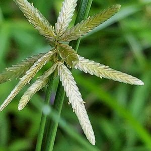 低山散歩🥾 暑さを避けての早朝山散歩、ショクヨウガヤツリやチャガヤツリをアップしましたが、今回は別の山に行く途中の田んぼの土手、アゼガヤツリですね😊 ブラシのように広がる花序ではなくて、散房状の花序をつけます。小花序は扁平な赤褐色の小穂が放射状にかたまった姿をしています。