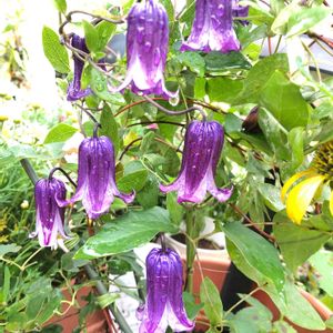 釣り鐘ちゃんがたくさんです😊 クレマチスですが、何だったかなー? 篭口でした💦花タグありました😅 プリンセスダイアナと一緒に植えてありますが、そちらはまだ開花しません。来年かな? 両方とも小さな苗をお安くゲットしたものです🙂298円だったかなー?398円だったかなー??(笑) 大苗は素晴らしい値段します💧