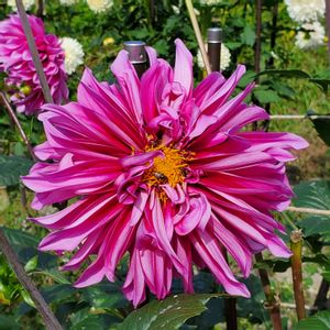 #32 ダリア 命名 沙雪 白もきれい。蜂と2ショット。