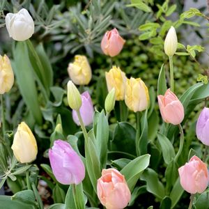 🏷️月曜日を爽やかに 幼稚園の花壇🌷💛💜🤍 チューリップの入れが可愛らしく、目につきました〜👀💕