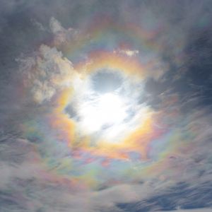 話ついでに今日の花粉光環です😱 雨上がり・強風・高めの気温と見事な数え役満です😭 2枚目は2020/3/11の月の花粉光環 3枚目〜5枚目は花粉光環に間違われやすいタイプの彩雲です。雲の種類で色づき方が結構違いますね。 (太陽を中心に同心円状に見えるものは光環や日光環とも呼ばれますが、花粉や黄砂や霧などとは異なり雲はかなり色相にムラが出るので、あまり使われない印象です)