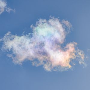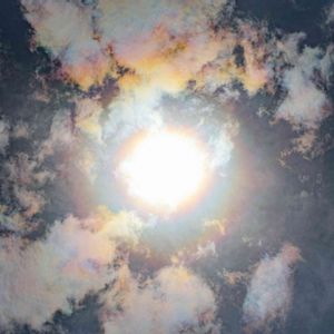 今日の彩雲です。 お昼前後に晴れ間があり、巻積雲?と高積雲がそれぞれ色づきました。 太陽光がモロにレンズに入り込む画角なので、設定はシャッタースピードが1/4000秒、絞りがF36、ISOが100と最大限暗くして撮っています。 絞っているのでフレアはある程度抑えられますが、根本的にハレ切りをしている昨日の写真ほどの色は出ていないことがわかるかと思います。 望遠で太陽ズームは目がやられちゃうので、もちろんファインダーではなくライブビュー越しの1枚です。
