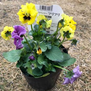 実はもう1苗買ってました〜!🎉 フリフリパンジー🌼 さっきのとは、少し感じが違います。✨ これも150円(税込)安くない? 色が気に入りました!可愛い💛💜 黄色と紫なんて、好きな色②色!✌️ さっきのと一緒に玄関先に飾ります。 我が家の一等地へ、決定!(^O^)